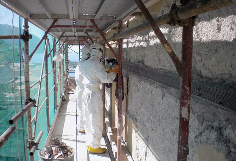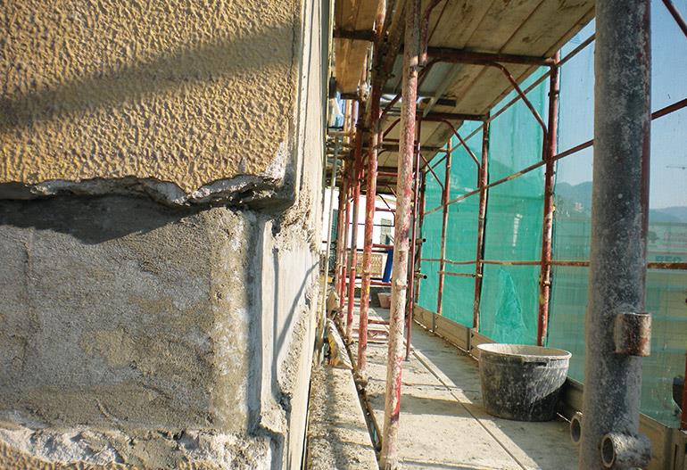 Fibrwrap Italy proposed and executed a solution using Tyfo® Carbon Systems (Tyfo® SCH-41 and Tyfo® S Epoxy) in two layers by confinement of the whole structure at each floor level at the free space zone between windows and balconies. The original plaster was removed on the application area and special high strength repair mortar was applied as substrate for the Tyfo Carbon Fiber.