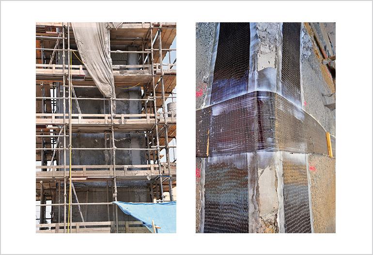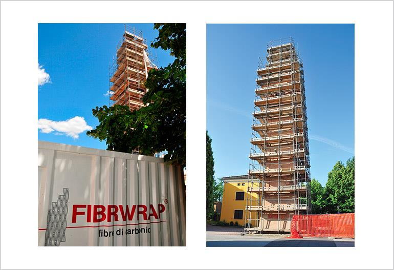 After the first phase, which entailed the application of a fiber-reinforced concrete jacket with shotcrete technique at the bottom part of the tower, then a combination of Tyfo® FIBRWRAP® Systems both Glass (SEH) and Carbon (SCH) was used to wrap the lower part of the belltower, in 2 layers, creating this way a sort of vertical and horizontal supporting grid.