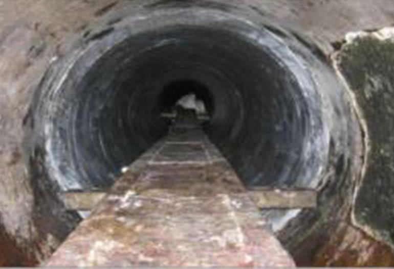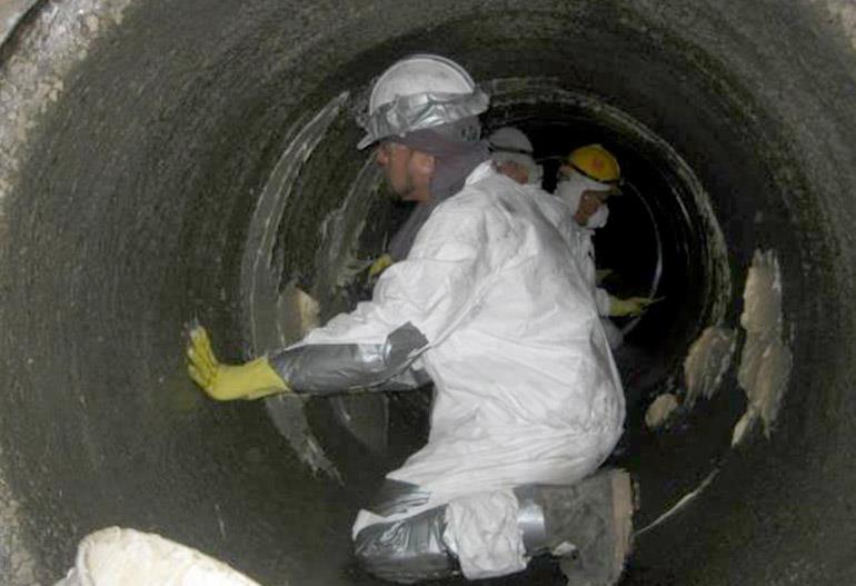 Arcelor Mittal Dofasco is the largest steel and iron ore manufacturer in Canada. The 48” PCCP RWR (re-circulating water return line) is a critical production pipeline. RFTC inspection revealed 14 spools ashaving ‘severe’ distress. These were targeted for repairs. As 9 out of 14 sections run under the #1 Caster building, a no-dig FRP repair was the most suitable compared to slip lining or tendon repair. After due diligence, Fibrwrap was selected to perform the structural repair using patented and proven ‘wet lay-up’ process during the December shutdown.