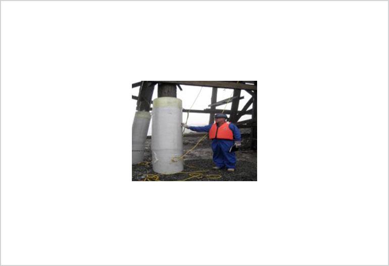 The TYFO® PR Jackets, combined with the TYFO® SEH-51A System was designed to be installed in segments and to provide the required additional strength. The tides in this area are over 20-feet and when the tide is all-the-way out, it was possible to work without divers. The soil was quickly excavated to allow the PR jackets to be installed 7-feet below the mud line. The jacket segments were then added and then wrapped with the TYFO® SEH-51A reinforcing fabric, saturated with the TYFO® SW (water curing) epoxy, until the entire pile was covered. The annular space between the PR jackets and the piles was filled with grout and then new cross bracing was installed to complete the project.
