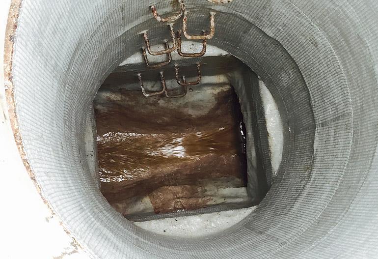 The manhole is located in a playing field and the connecting pipelines are 6m below ground. The customer preffered our solution because they will renovate the area completely and do not want any surprises in the future with their underground infrastructure. After renovation, the manhole was covered with a concrete slab. The pipelines are renovated with CIPP by LMJ A/S from Glustrup (near Kopenhagen) for which we worked as a subcontractor. The manhole showed cracks and leakages, these defects were repaired before the application of our composite solution, the Tyfo® Fibrwrap System. For this project we chose to use a Tyfo® WP epoxy primer (for damp surfaces) in combination with Tyfo® SEH-25A glassfiber and Tyfo® SW-1S epoxy. Not only is the manhole structurally upgraded with this solution, it also shields it from harmfull (bio)chemical gasses. The project took just 2 days to complete.