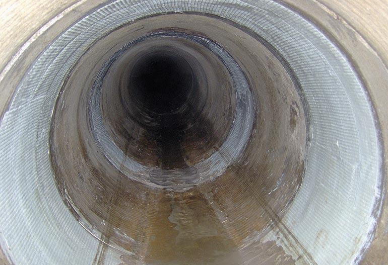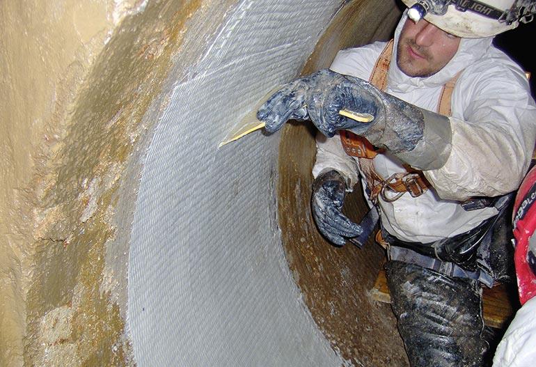 After cutting these cables running through the pipe, a provisional mortar was applied to tap the holes. In order to recover full integrity as original, the sealing and reinforcing of the pipe in the damaged areas was performed by applying specialized primer as first, followed by two layers of fiberglass Tyfo SEH saturated with high performance epoxy resin system. These latter were applied in hoop direction around the full perimeter of the pipe.