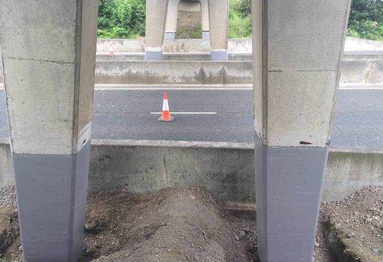 12 bridge pier columns required concrete repairs and protection on the busy A69 in Northumberland. The piers were excavated to a depth of 0.5m below ground level. They were then cleaned and repaired using traditional concrete repair techniques. A long term protection system using TYFO Fibrwrap Systems was then applied to the bottom 2m of the pier columns to protect from external corrosion and delamination.