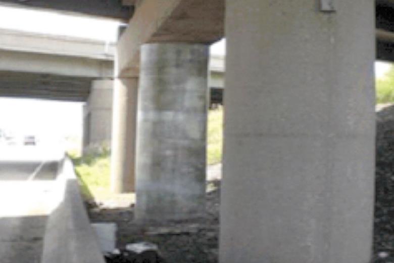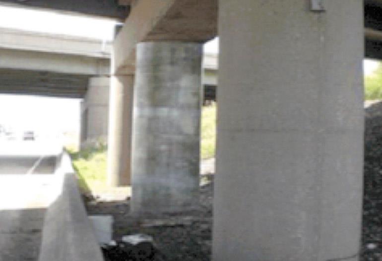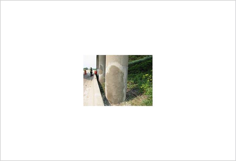 Many columns on numerous bridge overpasses showed signs of corrosion at the mid-height down to the base. The severe spalling and associated deteriorated reinforcement was mainly due to the close proximity of the columns to the busy Interstate. Constant splashing of snow and slush during the winter season enabled de-icing materials to deteriorate the concrete and reinforcement. The most severe corrosion was evident in the reinforcing ties.